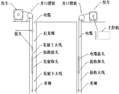井下無線電波透視儀主要由發(fā)射探頭、接收探頭、上下天線、數(shù)據(jù)采集系統(tǒng)和下井系統(tǒng)組成,設(shè)備組成示意圖如下圖。