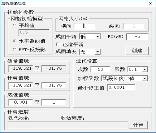電磁波CT軟件導(dǎo)入數(shù)據(jù)可直接進(jìn)行分析,層析成像處理參數(shù)界面如下左圖所示;層析處理后導(dǎo)出網(wǎng)格數(shù)據(jù),用surfe進(jìn)行成圖,如下右圖所示。