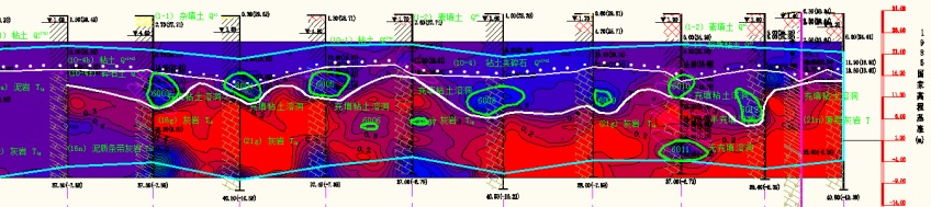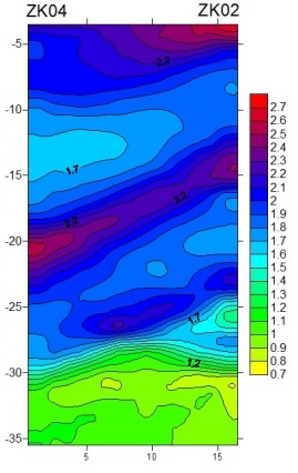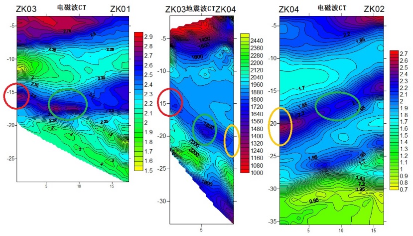 電磁波CT測試:ZK01-ZK03、ZK02-Zk04兩對鉆孔進(jìn)行測。