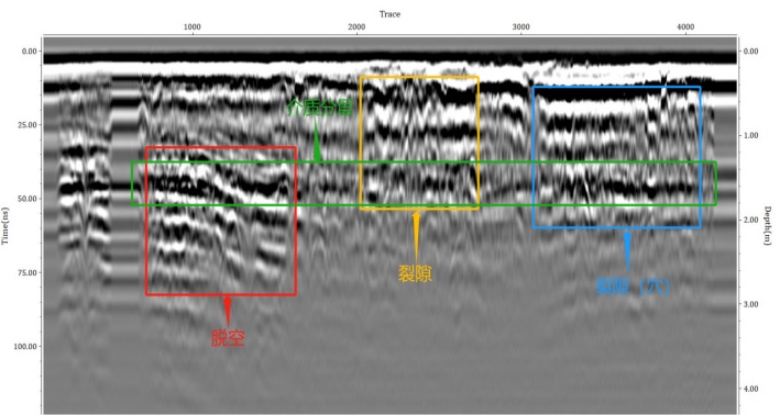說明:根據第一層檢測數據圖像分析可得,紅色方框標注區(qū)域為一段脫空區(qū),水平方向上從760道—1600道之間,黃色方框標注區(qū)域為一段淺層的裂隙,深度在1m以內,藍色方框標注區(qū)域為一段裂隙(穴),深度在1.5m以內,綠色方框標注區(qū)域有介質分層情況,同相軸方向呈連續(xù)狀態(tài)。
