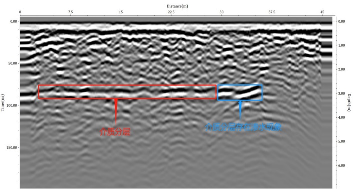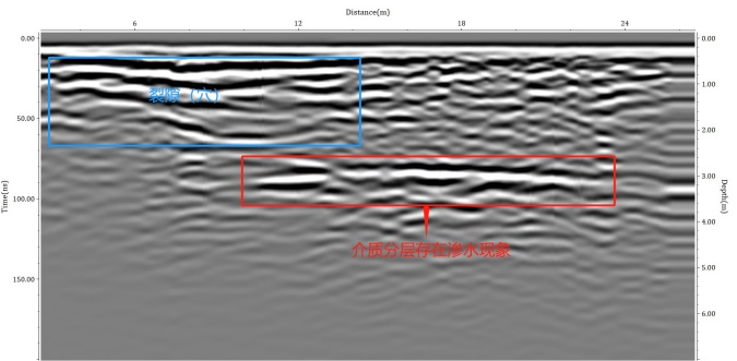 說明:根據第三層平臺檢測數據分析可知,紅色標注區(qū)域為一段介質分層,縱深在3m左右,在分析反射波波型得到,此段反射波振幅較大,由此得出此段介質分層存在滲水現象。藍色標注區(qū)域為一段淺層的裂隙(穴)。