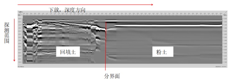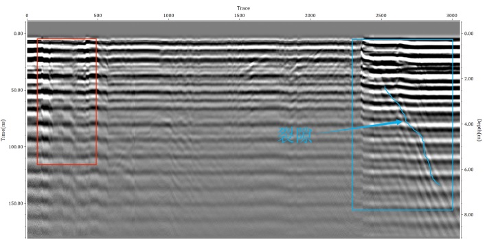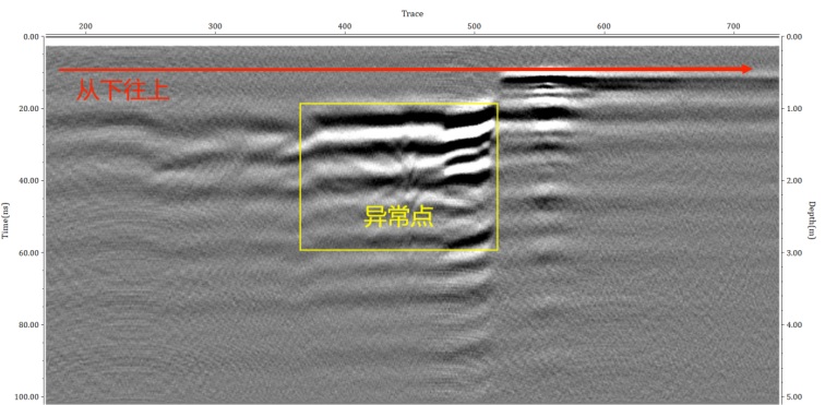 說(shuō)明:孔深度為18m,測(cè)線方向?yàn)閺南峦?,起點(diǎn)位置為0m,終點(diǎn)位置為48.25m,按照計(jì)算的得到比例尺為2.75,上圖所示異常起點(diǎn)位置為25.71m,異常終點(diǎn)位置為37.15m,計(jì)算可得該段強(qiáng)反射信號(hào)區(qū)域長(zhǎng)度為4.16m左右,該信號(hào)頂點(diǎn)離地面距離為4.03m。根據(jù)現(xiàn)場(chǎng)信息初步判斷該段強(qiáng)反射信號(hào)區(qū)域?yàn)楦邏盒龂姌丁?/span>