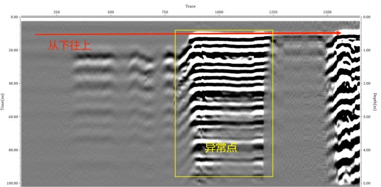 說(shuō)明:孔深度為16.7m,測(cè)線方向?yàn)閺南峦?,起點(diǎn)位置為0m,終點(diǎn)位置為38.77m,按照計(jì)算的得到比例尺為2.32,上圖所示異常起點(diǎn)位置為11.27m,異常終點(diǎn)位置為17.40m,計(jì)算可得該段強(qiáng)反射信號(hào)區(qū)域長(zhǎng)度為2.64m左右,該信號(hào)頂點(diǎn)離地面距離為9.21m。根據(jù)現(xiàn)場(chǎng)信息初步判斷該段強(qiáng)反射信號(hào)區(qū)域?yàn)楦邏盒龂姌丁?/span>