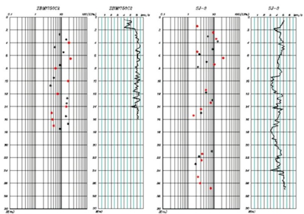 紅點為我公司鉆孔彈模數(shù)據(jù),黑點為加拿大彈模鉆孔儀數(shù)據(jù),旁邊是對應(yīng)聲波波速。
