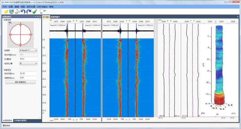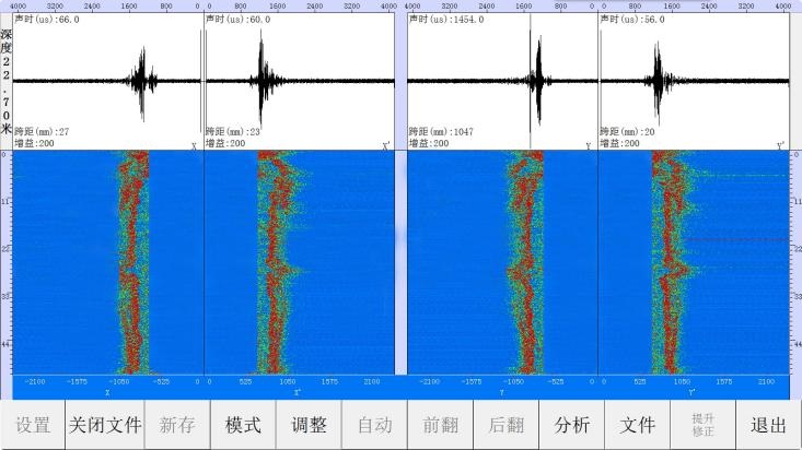 7、輸出結(jié)果內(nèi)容豐富,直觀準(zhǔn)確?,F(xiàn)場(chǎng)檢測(cè)完成后,實(shí)時(shí)輸出兩個(gè)剖面影像圖、XX’和YY’剖面偏離曲線圖和數(shù)表(包括每個(gè)測(cè)點(diǎn)的深度值、實(shí)測(cè)聲時(shí)值、探頭距孔壁的距離、測(cè)點(diǎn)位置孔徑值、偏移值和垂直度);