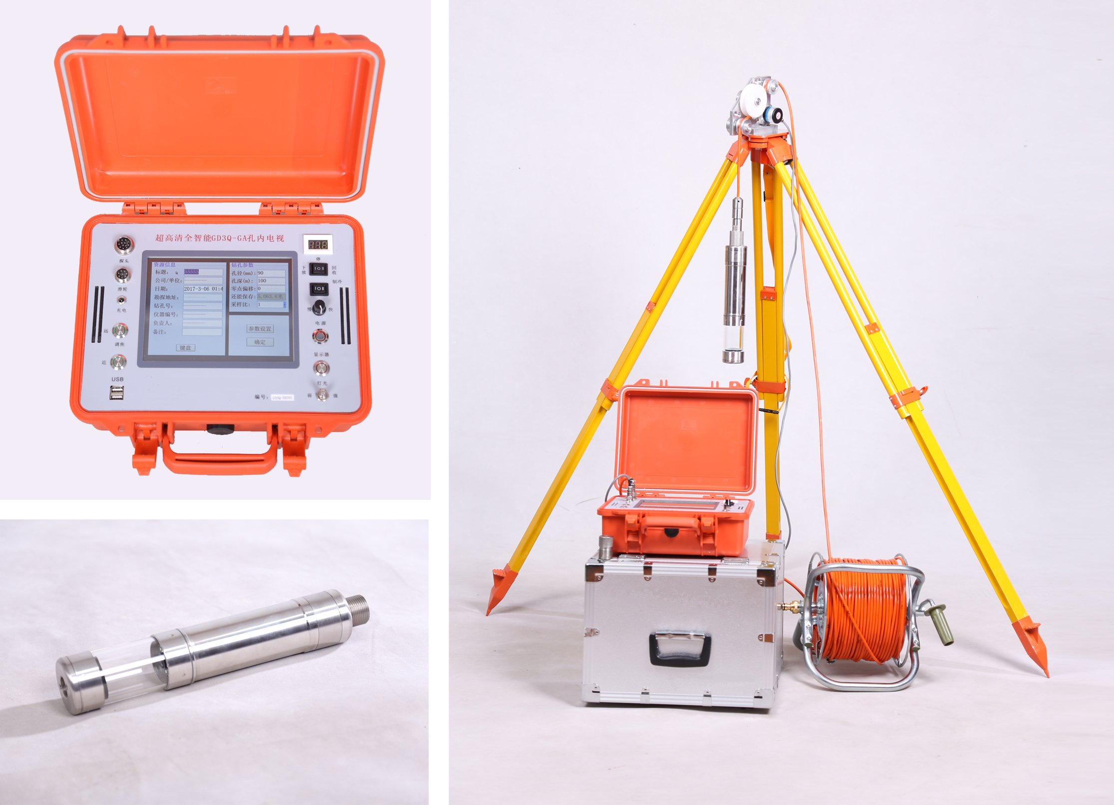 ?超細抗拉電纜:抗拉性強,信號傳輸快。01-D5號電纜是自主研發(fā)的專用電纜。電纜的直徑僅5mm,100米重2.6kg。是目前國內(nèi)孔內(nèi)電視中 最細的電纜,比其他廠家的電纜的重量減輕75%,方便運輸和現(xiàn)場使用。