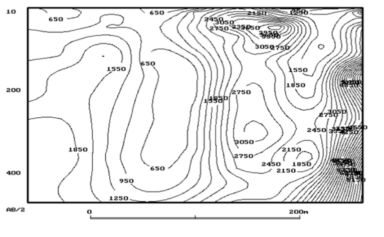 天津某銅礦剖面27-59號(hào)點(diǎn)之間視電阻率斷面等值線圖
