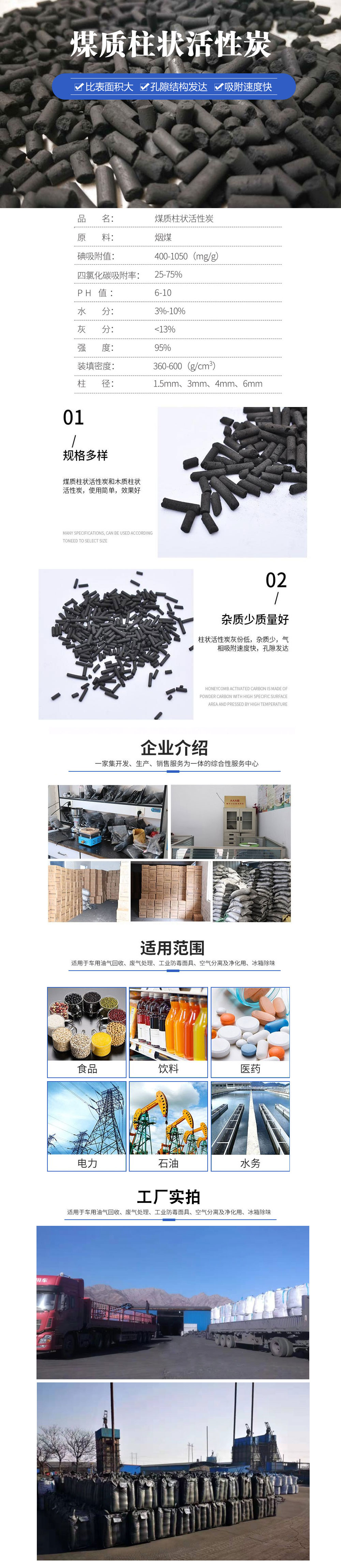 柱狀活性炭是以煤炭為原料、以煤油為粘合劑、經(jīng)磨粉、混配、擠壓成形、炭化、活化而成的圓柱形活性炭。該產(chǎn)品比表面積大、孔隙發(fā)達、強度高、吸附能力強、化學(xué)穩(wěn)定性好、可廣泛應(yīng)用于化工、制藥、食品等各種氣體的有害有毒及微生物凈化過濾、對低拂點的苯類、醇類、四氯化碳、三氯甲烷等有害氣體有很好的吸附作用,活性炭吸